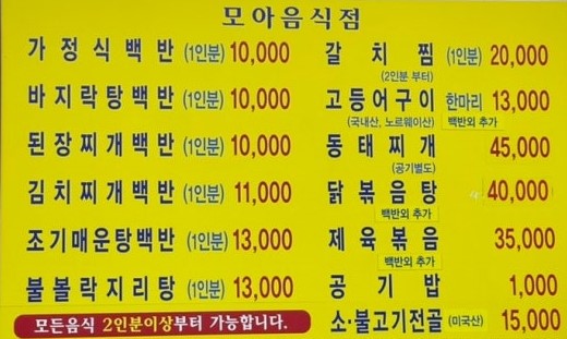 배가 출출해질 무렵, 현지인들이 즐겨 찾는다는 백반집을 발견했어요. 메뉴판은 온통 한글뿐이었지만, 가격이 착해 보여 반가웠죠. 우리는 조기매운탕을 주문했는데, 13,000원이라는 가격이 믿기지 않을 정도로 푸짐했답니다.