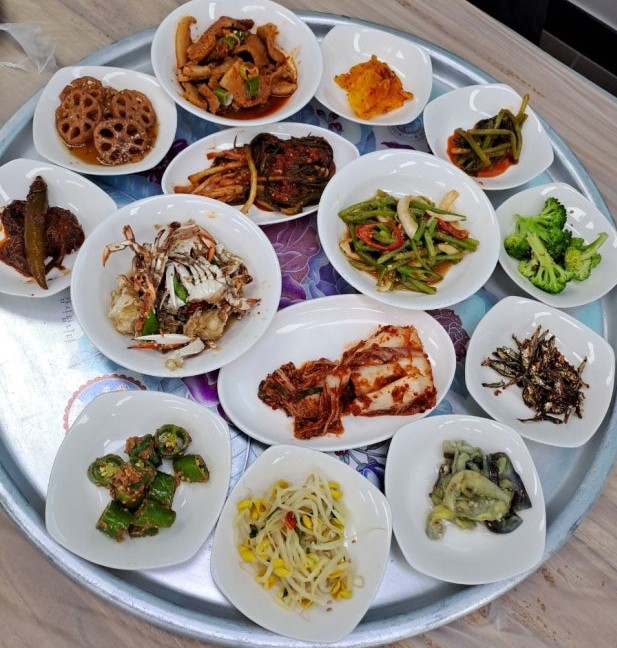 큰 쟁반에 담겨 나온 백반은 그야말로 잔치 상이었어요! 하얀 작은 그릇마다 각양각색의 반찬들이 가득~ 선명한 김치, 아삭한 연근조림, 향긋한 콩나물, 싱싱한 브로콜리, 그리고 가운데 있는 매콤한 조기매운탕까지! 눈으로 먹고 코로 먹고 입으로 먹는 삼중 행복을 느꼈답니다.