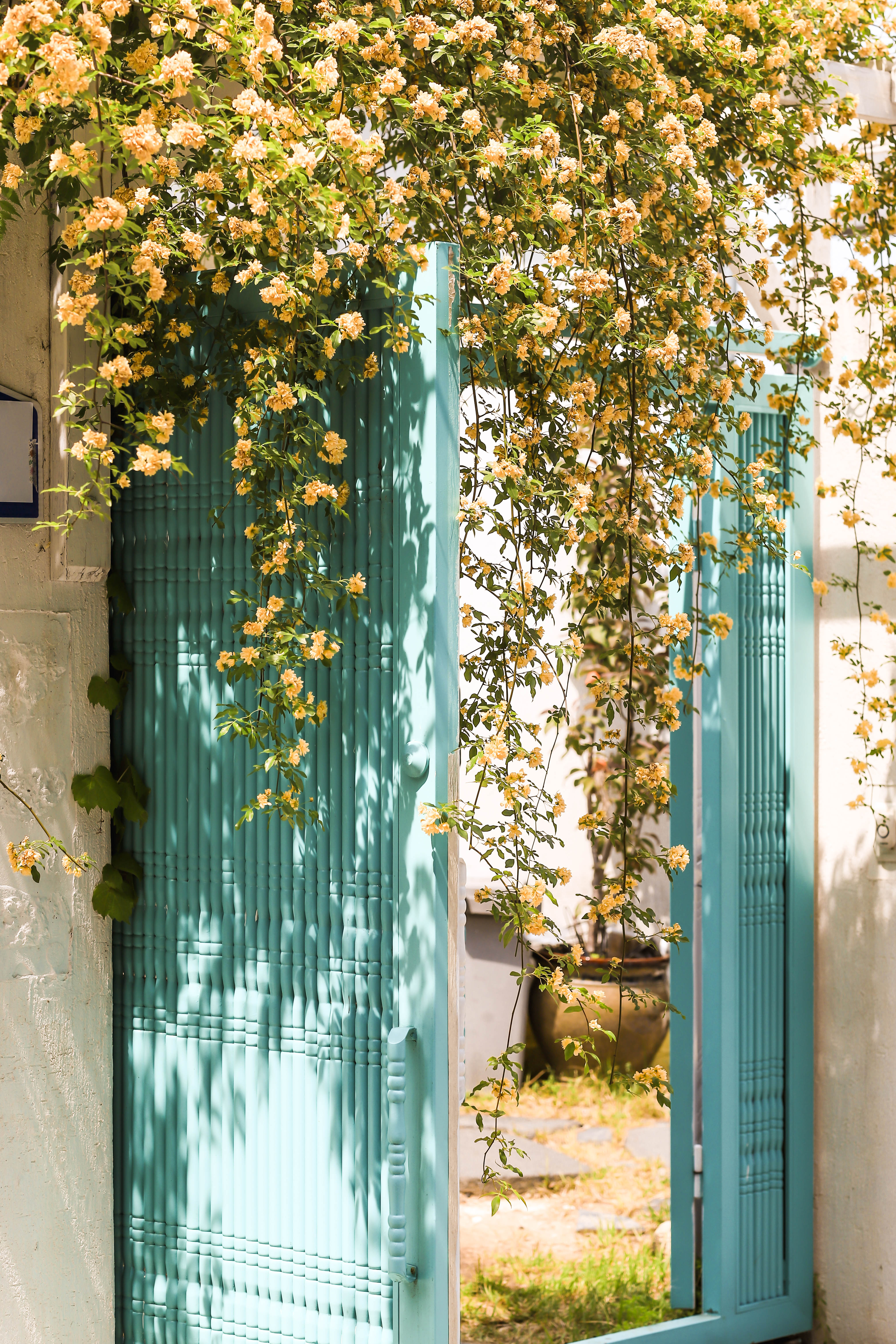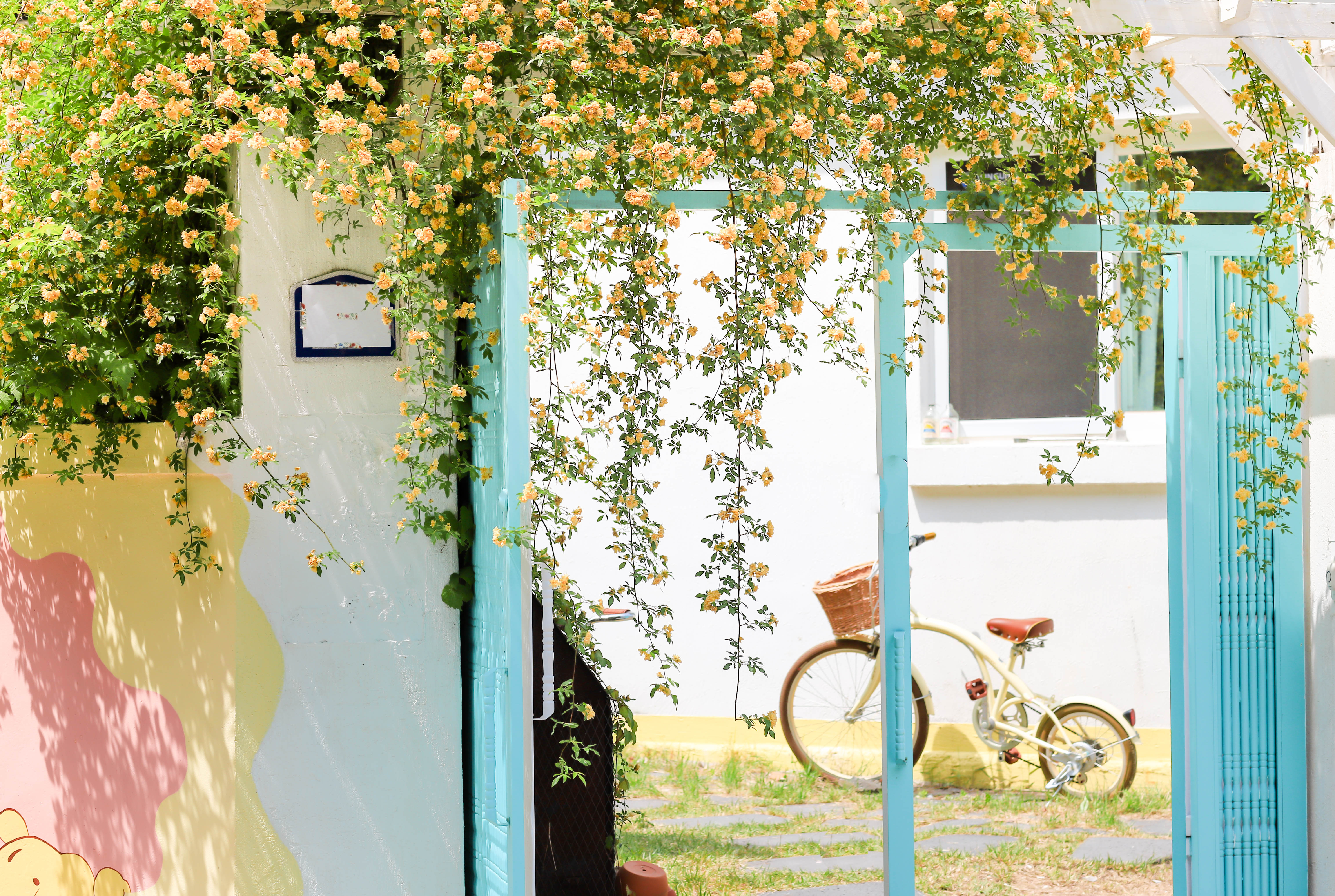 연한 하늘빛으로 칠해진 문 위로 노란 목향장미가 흐드러지게 피어 있었다.