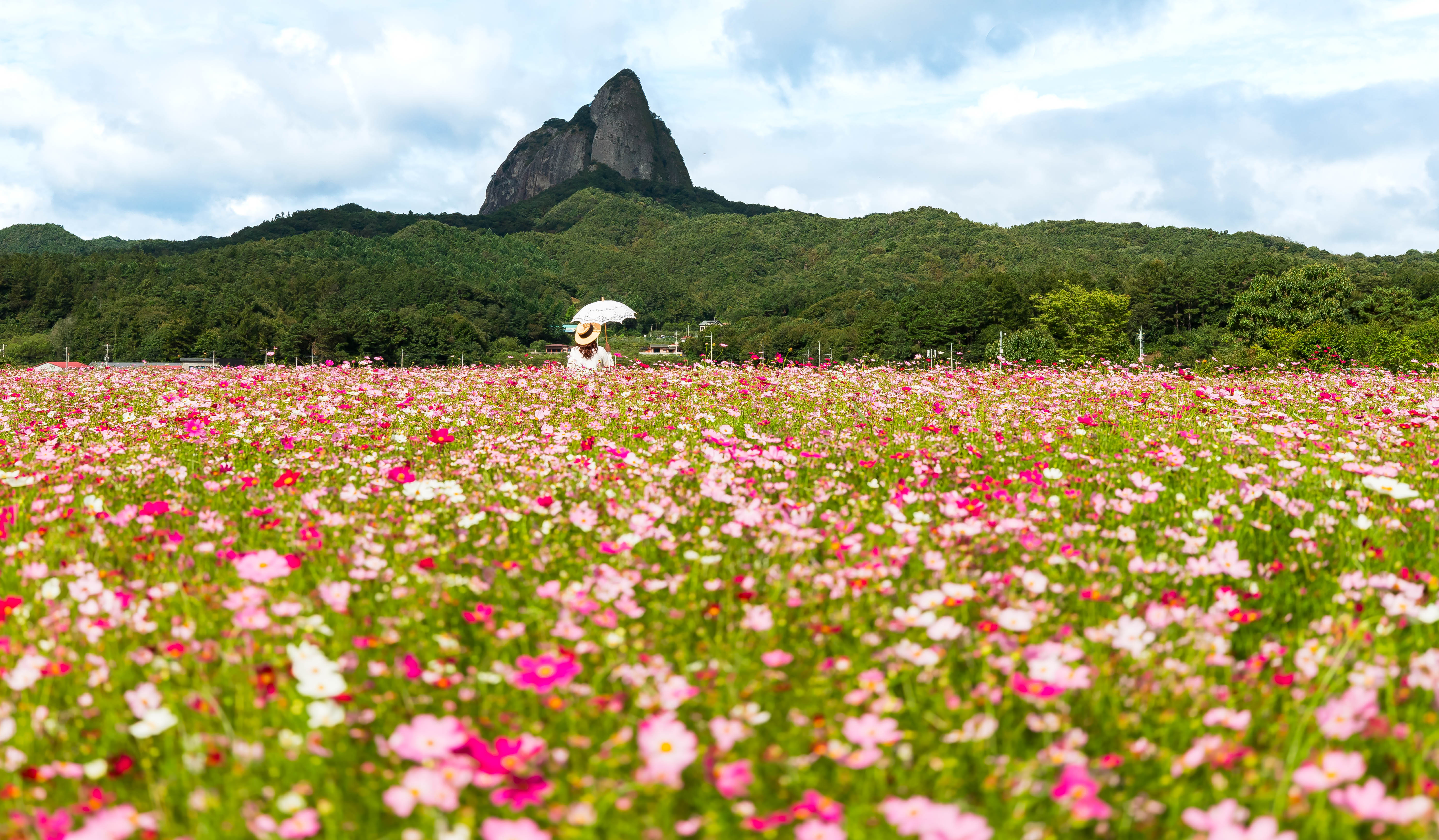 끝없이 펼쳐진 코스모스 밭 너머로 우뚝 솟은 마이산의 웅장한 모습! 분홍빛과 하얀 코스모스가 바람에 살랑살랑 흔들리는 모습과 뒤편의 기암괴석 마이산이 만들어내는 조화는 정말 환상적이었습니다.